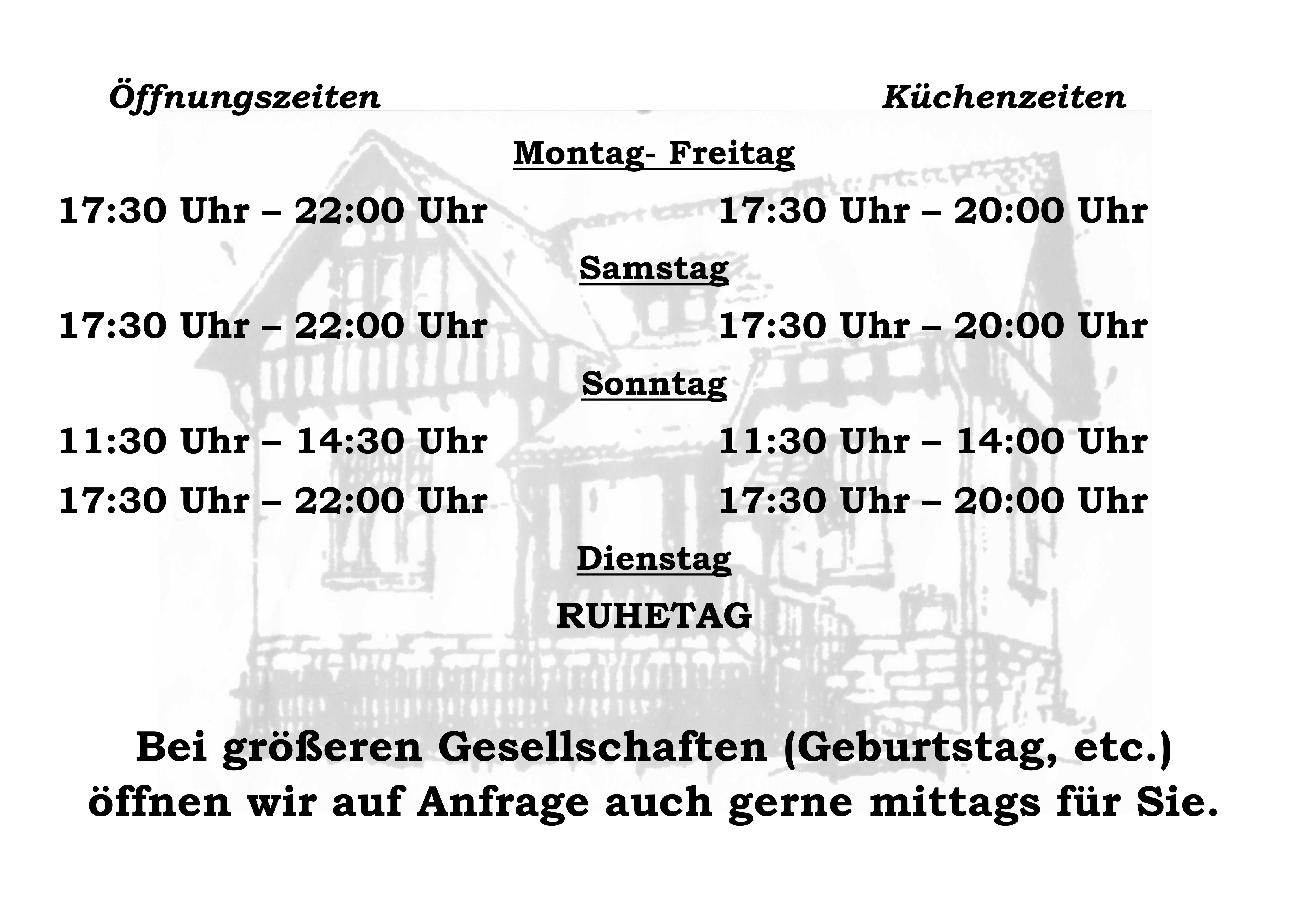 Abweichend zu unseren Öffnungszeiten können Sie für eine größere Gesellschaft (Geburtstag, Geschäftsessen, Beerdigung, etc.) unsere Räumlichkeit auch gerne für mittags anfragen.